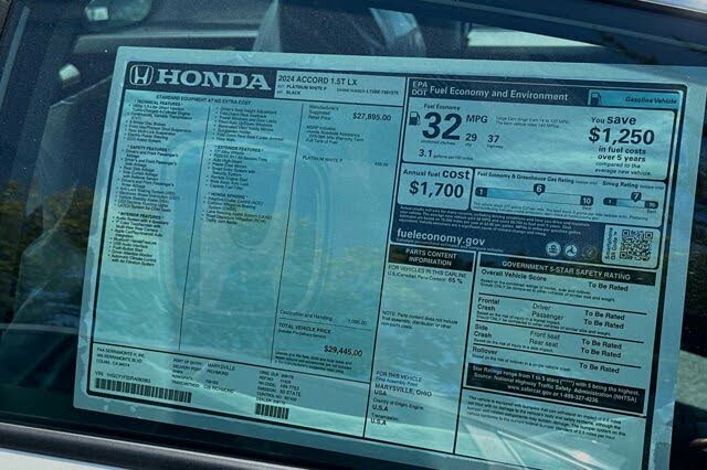 Wheels: 17" x 7.5" Blade Silver, Vehicle Stability Assist (VSA) Electronic Stability Control (ESC), Valet Function, Urethane Gear Shifter Material, Trunk Rear Cargo Access, Trip computer, Transmission: Continuously Variable -inc: econ and normal modes, Traffic Jam Assist, Tires: 225/50R17 94V AS, Tire Specific Low Tire Pressure Warning. This Honda Accord Sedan has a dependable Intercooled Turbo Regular Unleaded I-4 1.5 L/91 engine powering this Variable transmission.* Experience a Fully-Loaded Honda Accord Sedan LX *Strut Front Suspension w/Coil Springs, Steel Spare Wheel, Side Impact Beams, Seats w/Cloth Back Material, Remote Releases -Inc: Power Cargo Access, Remote Keyless Entry w/Integrated Key Transmitter, Illuminated Entry, Illuminated Ignition Switch and Panic Button, Redundant Digital Speedometer, Rear Cupholder, Rear Child Safety Locks, Radio w/Seek-Scan, Clock, Speed Compensated Volume Control, Steering Wheel Controls, Voice Activation and Radio Data System, Quasi-Dual Stainless Steel Exhaust, Proximity Key For Push Button Start Only, Power Rear Windows, Power Fuel Flap Locking Type, Power Door Locks w/Autolock Feature, Power 1st Row Windows w/Driver And Passenger 1-Touch Up/Down, Perimeter Alarm, Outside temp gauge, Outboard Front Lap And Shoulder Safety Belts -inc: Rear Center 3 Point, Height Adjusters and Pretensioners, Multi-Link Rear Suspension w/Coil Springs.* Stop By Today *A short visit to Honda of Serramonte located at 485 Serramonte Blvd, Colma, CA 94014 can get you a tried-and-true Accord Sedan today![!@@Additional Info@@!]Turbocharged,Front Wheel Drive,Power Steering,ABS,4-Wheel Disc Brakes,Brake Assist,Aluminum Wheels,Tires - Front Performance,Tires - Rear Performance,Temporary Spare Tire,Power Mirror(s),Rear Defrost,Intermittent Wipers,Variable Speed Intermittent Wipers,Daytime Running Lights,Automatic Headlights,LED Headlights,Automatic Highbeams,AM/FM Stereo,MP3 Player,Bluetooth Connection,Telematics,Auxiliary Audio Input,WiFi Hotspot,Smart Device Integration,Requires Subscription,Steering Wheel Audio Controls,Bucket Seats,Rear Bench Seat,Adjustable Steering Wheel,Trip Computer,Power Windows,Keyless Start,Keyless Entry,Power Door Locks,Cruise Control,Adaptive Cruise Control,Climate Control,A/C,Cloth Seats,Driver Vanity Mirror,Passenger Vanity Mirror,Driver Illuminated Vanity Mirror,Passenger Illuminated Visor Mirror,Floor Mats,Keyless Start,Power Windows,Power Door Locks,Trip Computer,Security System,Immobilizer,Cruise Control Steering Assist,Traction Control,Stability Control,Traction Control,Front Side Air Bag,Lane Departure Warning,Lane Keeping Assist,Lane Departure Warning,Front Collision Mitigation,Driver Monitoring,Tire Pressure Monitor,Driver Air Bag,Passenger Air Bag,Front Head Air Bag,Rear Head Air Bag,Passenger Air Bag Sensor,Front Side Air Bag,Rear Side Air Bag,Knee Air Bag,Child Safety Locks,Back-Up Camera