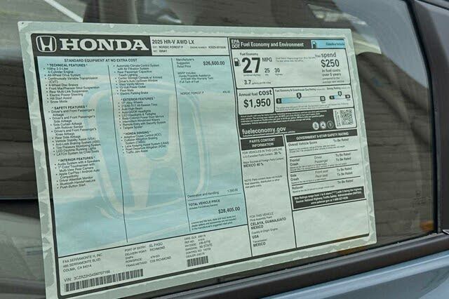 Wheels: 17" Silver Painted Alloy, Vehicle Stability Assist (VSA) Electronic Stability Control (ESC), Urethane Gear Shifter Material, Trip computer, Transmission: Continuously Variable (M-CVT) -inc: 3-mode dynamic drive (econ, normal and snow), Traffic Jam Assist, Tires: 215/60R17 96H, Tailgate/Rear Door Lock Included w/Power Door Locks, Strut Front Suspension w/Coil Springs, Steel Spare Wheel. This Honda HR-V has a dependable Regular Unleaded I-4 2.0 L/122 engine powering this Variable transmission.* Experience a Fully-Loaded Honda HR-V LX *Single Stainless Steel Exhaust, Side Impact Beams, Seats w/Cloth Back Material, Rocker Panel Extensions and Black Wheel Well Trim, Remote Releases -Inc: Mechanical Fuel, Remote Keyless Entry w/Integrated Key Transmitter, Illuminated Entry and Panic Button, Rear Cupholder, Rear Child Safety Locks, Radio: 180-Watt Audio System w/4 Speakers -inc: 7-inch color touchscreen, Apple CarPlay and Android Auto compatibility, Bluetooth HandsFreeLink and streaming audio, 2.5-amp USB-A smartphone/audio interface port in front console, HondaLink, SMS text message function, Radio Data System (RDS) and Speed-Sensitive Volume Compensation (SVC), Radio w/Seek-Scan, Clock and Steering Wheel Controls, Proximity Key For Doors And Push Button Start, Power Rear Windows, Power Door Locks w/Autolock Feature, Power 1st Row Windows w/Driver 1-Touch Up/Down, Permanent Locking Hubs, Perimeter Alarm, Outside temp gauge, Outboard Front Lap And Shoulder Safety Belts -inc: Rear Center 3 Point, Height Adjusters and Pretensioners, Multi-Link Rear Suspension w/Coil Springs, Manual Tilt/Telescoping Steering Column.* Stop By Today *Stop by Honda of Serramonte located at 485 Serramonte Blvd, Colma, CA 94014 for a quick visit and a great vehicle![!@@Additional Info@@!]All Wheel Drive,Power Steering,ABS,4-Wheel Disc Brakes,Brake Assist,Aluminum Wheels,Tires - Front All-Season,Tires - Rear All-Season,Temporary Spare Tire,Power Mirror(s),Rear Defrost,Intermittent Wipers,Variable Speed Intermittent Wipers,Rear Spoiler,Power Door Locks,Daytime Running Lights,Automatic Headlights,LED Headlights,Automatic Highbeams,AM/FM Stereo,MP3 Player,Bluetooth Connection,Telematics,Auxiliary Audio Input,Smart Device Integration,Requires Subscription,Steering Wheel Audio Controls,Bucket Seats,Pass-Through Rear Seat,Rear Bench Seat,Adjustable Steering Wheel,Trip Computer,Power Windows,Keyless Entry,Power Door Locks,Keyless Start,Keyless Entry,Power Door Locks,Cruise Control,Adaptive Cruise Control,Climate Control,A/C,Cloth Seats,Driver Vanity Mirror,Passenger Vanity Mirror,Floor Mats,Power Windows,Power Door Locks,Trip Computer,Security System,Immobilizer,Cruise Control Steering Assist,Traction Control,Stability Control,Traction Control,Front Side Air Bag,Lane Departure Warning,Lane Keeping Assist,Lane Departure Warning,Front Collision Mitigation,Tire Pressure Monitor,Driver Air Bag,Passenger Air Bag,Front Head Air Bag,Rear Head Air Bag,Passenger Air Bag Sensor,Front Side Air Bag,Rear Side Air Bag,Knee Air Bag,Child Safety Locks,Back-Up Camera